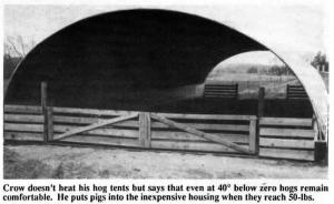 "There's nothing fancy about it, but it works and lets me raise hogs cheap," says Crow, who put up a pair of "tarp tents" two years ago and liked them so well that he became the distributor for eastern Canada and recently began advertising in the U.S. "Tarp tents work great for farmers who'd rather finish their feeder pigs than sell them, but can't afford a new finishing barn. They cost about $2.50 per square foot. Conventional hog barns cost $10 to $12 per square foot and deluxe conventional finishing barns cost up to $40 per square foot. I put my pigs in when they weigh about SO lbs. With sand floors, natural ventilation, straw bedding, and lots of room to run around the hogs do very well. I don't try to heat the buildings, but even at 40 below the hogs stay comfort-able especially when I put in extra bedding. The main tarp takes only one day to put up and one day to take down. Small tears are easy to patch up. A replacement tarp would cost about $2,000."