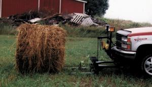 Larry Herin of Hesperia, Mich., wanted to haul round bales between farms without the hassle of using a tractor. He solved the problem by building a bale fork that mounts on any pickup with a hydraulic-operated snow-plow lift bracket.