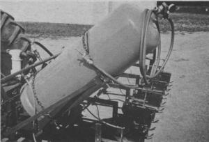 Peterson mounted the tank on an angle iron frame mounted on his sprayer. The tank is secured to the frame with chains and can be easily removed for other uses. No precleaning of the tank was required.