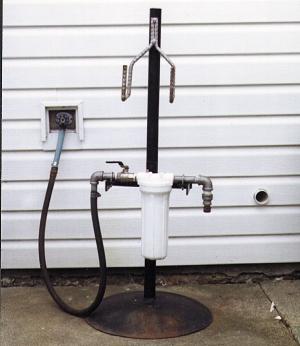 I mounted a ball valve on the input side of the filter and attached a 6-ft. length of hose to it which hooks up to a valve on my house. I mounted an elbow fitting on the output side of the filter so I can hook a garden hose up to it to fill the sprayer tank. When I'm done I hang the hose on a pair of hooks at the top of the pipe.