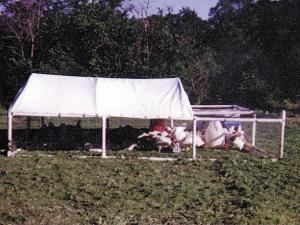 We've come up with a complete system for safely and efficiently raising chickens on open range. We sell portable plastic pens that measure 12 ft. long, 8 ft. wide, and 2 ft. high and are screened over with chicken wire. Part of the roof is covered with poly cloth that provides shelter from bad weather. The sides of the pen can also be closed in with poly cloth. If it rains or gets cold, the 75 to 80 birds in each pen huddle together in the closed-in, protected area. There's a small trough feeder in each pen as well as a waterer.