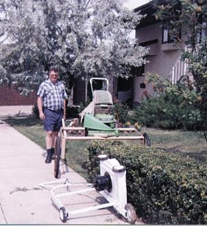 "It's the lazy man's way to trim a hedge. I can trim my entire 120-ft. long hedge in only about 5 minutes," says Beler, who simply mounted push-type mowers on wheeled carts. The top trimmer consists of a 22-in. wide Lawn Boy mower mounted on a steel frame that rides on a pair of 26-in. high bicycle wheels. The wheels hold the mower about 2 1/2 ft. off the ground. A 6-ft. long, 2-in. sq. wooden handle mounts on one side of the frame.