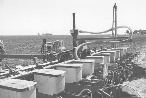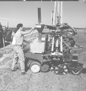 Broaddus mounted a "swing arm" on his planter that's equipped with a cone-type decelerator. It swings across the full width of the planter, making it easy to fill.