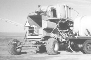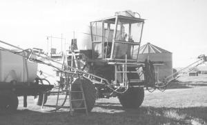 "I already had the combine and had built my own cab for it. I kept the cab when I converted the combine to a sprayer. The boom sections are independently controlled from the cab by solenoid valves. The original header lift cylinders are used to raise and lower the entire boom, and another pair of cylinders is used to raise the wings for use on hillsides and for transport. In transport the wings fold back beside the combine for a total road width of 12 ft."