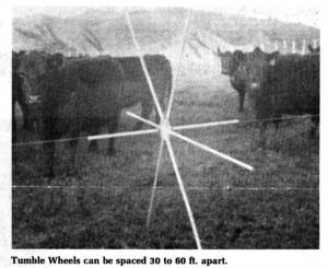 The Tumblewheels can be moved freely over rolling terrain and are generally spaced 30 to 60 ft. apart. On original models, the wire had to be threaded through each wheel. New models are designed with a clip-on feature which eliminates having to "needle thread" each wheel. Individual wheel spindles are large enough to take a wire knot, and insulated to prevent grounding of the wire. Kit of five wheels sells for right at $85 fob.