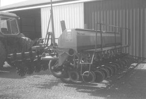 The Ottoville, Ohio, farmer has a pull-type 15-ft. drill and pulls a commercial two-bar tine tooth harrow behind it to incorporate seed and redistribute residue. The safety railing on back of the drill is 32 in. high and runs the full width of the drill. He used 1-in. sq. tubing to build the railing as well as the brackets that support it. The brackets are bolted to angle irons under the catwalk. Steps on one side of the catwalk fold up out of the way for transport.