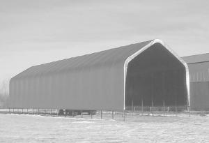 Each "Sun West Shelter" is 27 ft. wide by 96 ft. long by 25 ft. high and holds 26 typical bale wagon stacks. They're also suitable for machinery storage.Because of the roof's pitch, snow slides off before any accumulation can put stress on the cover. The buildings are modular, meaning that the design is such that two or more shelters can be connected to each other. Gable ends are also an available option.