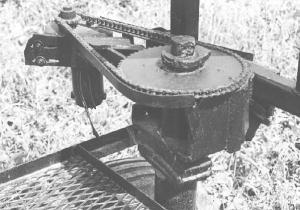 The picker is powered by an electric start, 3 1/2 hp Briggs & Stratton gas engine mounted on back and has three speeds forward and one reverse. Gears are shifted with an overhead connecting linkage. The clutch is centrifugal, so the amount of acceleration applied regulates travel speed. The rig steers electronically via a toggle switch. Pushing the switch one way steers the rig to the left, and pushing the switch the other way steers it to the right. A small electric motor drives a small sprocket which in turn actuates a larger sprocket via a link chain to turn the front wheels. Both the front and back wheels are spaced 28 in. apart.