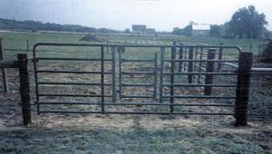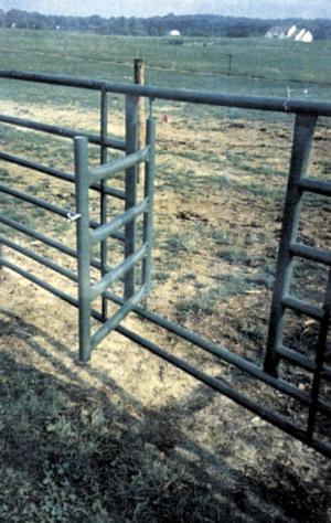 Gate-Within-A-Gate FENCING Gates 24-3-34 This gate-within-a-gate lets an individual pass through large gates without having to swing the entire gate open. Keeps livestock in without crowding up against it. It also makes it easier for kids, wives and anyone who's physically challenged to pass through a gate. The latching mechanism is as easy to unlatch as a toolbox and the gate itself weighs only 5 lbs.