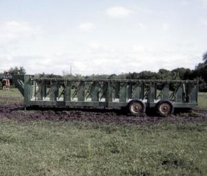 The wagon is mounted on springs and pulls better than many livestock trailers, says Yarbrough. Drop legs on front hold it stationary when in use. "Even 1,600-lb. Simmental cows haven't been able to move it," notes Yarbrough.