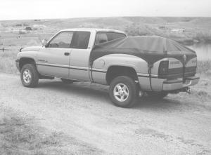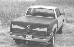 "It keeps your cargo clean and dry and your pickup's paint job intact," says Pat Burkey. "The cover expands, but doesn't stretch. Once the load is removed the skin goes right back to a tailored fit flat over the box. All contact surfaces are lined with a soft poly vinyl. When you're done using the cover you can fold it up and store it behind the seat. We custom fit each make, model and year for your specific pickup."