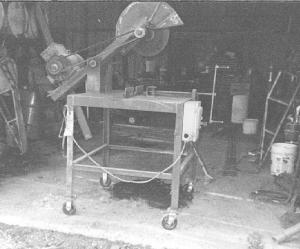 "The chop saw mounts on four wheels and weighs about 300 lbs. It has more power and can cut through bigger material than most commercial models. The machine will cut right through a 10 by 13-in. piece of steel, and I made it big enough that I can use a bigger 26-in. dia. blade if I want. I used 8-in. channel iron to build a pivoting arm that supports the motor and saw arbor. A threaded lever is used to tighten the vice to hold material in place. Pulling down on another lever brings the blade into the material for cutting. I built it so that the 3-ft. sq. work table is a little taller than my shop workbenches. As a result, I can cut a 20-ft. long piece and keep the material above the work bench.