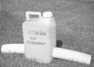 Rat Restaurant IRRIGATION 24-5-30 Tony Alson of Brockford, England, named his rat-killing invention the "Rat Restaurant". He runs a piece of 3-in. dia. pipe through the bottom of a 2 1/2-gal. plastic jug. The pipe is positioned bout 1 in. above the bottom of the jug. There's a small hole cut in the bottom of the pipe at the center of the jug. Alson fills the jug with bait, which then cascades all around the pipe. The rats get bait through the hole in the pipe. The advantage of the design is that the rats can see all the way through the pipe so they don't sense a trap, and the container holds plenty of bait. Also, pets and other animals can't get at the bait.