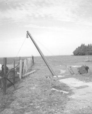 The winch attaches to the pickup's gooseneck hitch and consists of a steel frame that supports a pair of gin poles. A homemade electric winch, consisting of an automotive flywheel driven by a starter motor, mounts on the front part of the frame and connects by cable to the top of the poles. The winch is controlled by a friction brake. Both poles pivot at the bottom on the frame and extend forward when not in use.