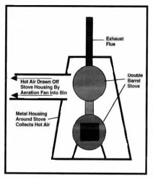 I built a simple wood-fired grain dryer out of scrap metal that works well for me and has saved a lot of money. It consists of a double drum wood burning stove that I made with scrap barrels and a commercial stove-building kit. I built a housing around the stoves that holds in the hot air off the stoves. A flue carries smoke up out of the housing, while clean hot air is sucked out from the housing by the bin aeration fan through a large duct that exits one side. After three years of use, it still works good. (Alvin J. Deugau, Box 61, Outlook, Sask. S0L 2N0 Canada)