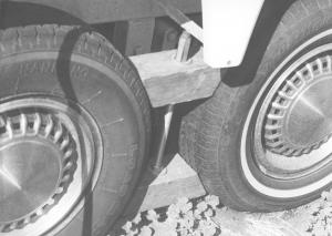 Easy -To-Use Wheel Chocks For Tandem Axle Trailers TIRES/WHEELS Handling 24-6-41 William E. Erickson, Ellensburg, Wash.: "I use a pair of 4 by 4's connected by a threaded rod to make easy-to-use wheel chocks for tandem axle trailers. The boards put pressure between the two tires to keep them from moving. First, I determined where I wanted the blocks and then cut their ends to fit the curvature of the tires. Then I drilled a hole through the middle of each 4 by 4 and measured to see how long the rod would need to be, allowing room for a nut and washer at the bottom and a coupler nut and a washer on top. I use an open-end wrench to tighten the blocks.