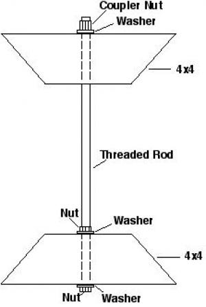 William E. Erickson, Ellensburg, Wash.: "I use a pair of 4 by 4's connected by a threaded rod to make easy-to-use wheel chocks for tandem axle trailers. The boards put pressure between the two tires to keep them from moving. First, I determined where I wanted the blocks and then cut their ends to fit the curvature of the tires. Then I drilled a hole through the middle of each 4 by 4 and measured to see how long the rod would need to be, allowing room for a nut and washer at the bottom and a coupler nut and a washer on top. I use an open-end wrench to tighten the blocks.