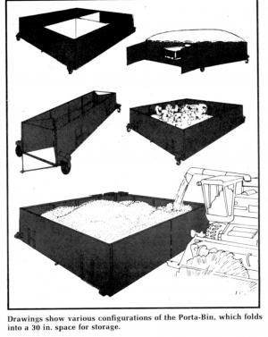 Porta-Bin comes in three sizes. The 16 by 16 by 8-ft. model has 2,500 bu. capacity; the 16 by 32 by 8-ft. model holds 5,000 bu.; and the 32 by 32 by 8 ft. model holds 9,000 bu. All models are hinged so they accordion-fold for storage.