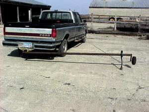 Wichmann mounted a single Danish tooth at the end of the marker to form the row mark. A used 6-in. lawn mower wheel mounts at the end of the tubing to become both a depth gauge and a carrier for the Danish tooth. Chain runs from the end of the marker to a hook on the front bumper of the pickup.
