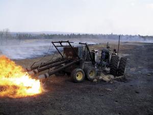 While a burner is operating in a field, Guptill stations other workers around the edge to watch for and control any fires that might get out of control.