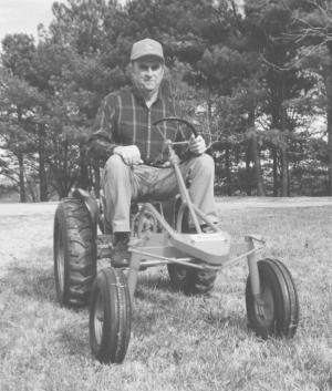 Metz used the Cub Cadet's transaxle, and hydrostatic transmission. The front axle assembly was fabricated from pipe and strap iron. The rack and pinion steering system is off the Wheel Horse. Power is provided by a 6 hp Kohler gas engine that mounts on back. The engine direct-drives a hydrostatic pump. A 6-in. dia., 12-in. long gas tank is located behind the seat and in front of the engine.
