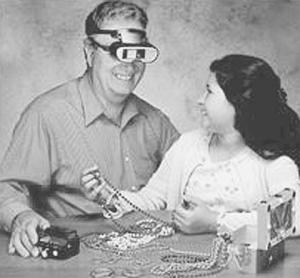 The headset is worn like a pair of glasses and contains a micro camera and small screen, so whatever is in front of the camera, no matter what distance, appears right in front of the user's eyes. It can magnify up to 30 times, allowing the user to read books, play cards or read fine print on legal contracts.