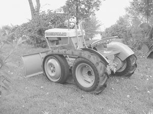Tracked Tractor Built For $150 TRACTORS Made-It-Myself When I opened up a copy of FARM SHOW a couple issues ago I couldn t believe my eyes when I saw the home-built tracked tractor put together by Jim Brown of Lincoln Vermont says Tad Schreiner Prior Lake Minn I had just finished building my own tracked tractor and I was surprised we had both used some of the same ideas Schreiner converted a Bolens garden tractor adding an automotive rear end and tracks made from tractor tires It was a fun project Getting everything to work together was a bit of a challenge but it was worth every minute of it the first time I took it for a ride It s powerful for its size and extremely maneuverable says Schreiner He obtained a 1963 Bolens 800 garden tractor with a blown engine and went to work on it He took off the front axle replacing it with the rear end off a Dodge Caravan which he narrowed up to fit the frame The axle bolts solidly in place He put donut-type 15-in spare tires on front and left the 23-in tractor tires on back He installed an 8 hp Briggs & Stratton engine reworking the mounting blocks and modifying the hood The original transmission remained in place A steel pipe subframe under the tractor s original frame allows the front axle to slide back and forth To put the tracks on I slide the front axle all the way back so that the front and rear tires touch each other After installing the tracks I pull the front axle forward and drop a steel pin into place on each side to lock the tracks in place says Schreiner To make the tracks Schreiner cut the sidewalls off a pair of 6 by 30 bias-ply rear tires off a rear engine Allis Chalmers cultivating tractor He ran a row of sheet metal screws through the inside middle part of the track spacing the screws about 3 1/2 in apart The screw heads dig into the tires and help keep them from coming off when turning A pair of steering levers are used to control the drum brakes on the tractor s rear axle He used 11 ga steel to build a 50-in wide 16-in high blade on front of the tractor The blade can be raised up and down and locked into place at six different positions by pulling on a lever that used to raise and lower the mower deck The blade can also be angled from side to side A spring-loaded pin inside a steel cylinder mounted behind the blade is used to control blade angle A cable runs from the pin back to a lever on the hood Pulling on the lever releases the pin Pushing another lever that s attached by linkage to the blade moves it either to the left or right It works surprisingly well and does very little damage to the ground It s also very maneuverable says Schreiner who finished building the rig last summer I painted it Caterpillar yellow and applied decals on the sides and front that read Taderpillar T 850 I call it the 850 because it has an 8 hp engine and a 50-in blade I chose the Bolens tractor because it has a cast iron rear end and transmission which is much stronger than aluminum and should keep the tracks from snapping the rear axle The tractor was given to me I paid $35 for the front axle and $70 for the tractor tires that I used to make the treads I already had the engine My total cost was only about $150 Contact: FARM SHOW Followup Tad Schreiner 16258 Suel Lane Prior Lake Minn 55372 ph 952 447-5421