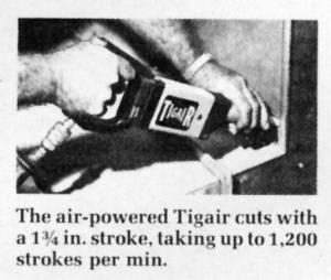 Air-Powered Hacksaw FARM SHOP Tools 1-6-23 If you do a lot of metal fabricating work in your farm shop, you'll be interested in the "Time Savin' Tigair", an air powered portable hacksaw marketed by The Sheffield House, Montrose, Calif., and manufactured by Tigair Products of Los Angeles. Operating on 10 to 100 lbs, of air pressure, its speed is adjustable from 90 to 1,20013/4 in. strokes per minute. Using standard high speed hacksaw blades, it cuts up, down, straight line or in tight curves and produces a burrless cut that virtually eliminates final grinding, according to Jack Skeehan, sales manager. Cutting speed is adjustable downward from 1,200 strokes per min, and, unlike electric tools, it cannot be damaged by stalling, Skeehan points out.