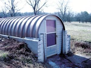 Using his backhoe, he dug a trench into the side of a hill, making it wide enough to accommodate the roof and deep enough to give him 8 ft. of head clearance in the center. To support the roof, he laid railroad tie support walls on the sides. Dirt was backfilled around the side and end walls. The open end was closed in with wood and a storm door installed.
