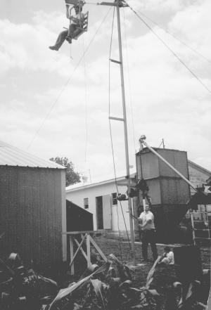 When the trolley reaches the other end, the operator at the 28-ft. pole releases a brake on the winch, dropping the end of the cable down to about 9 ft. off the ground. Then the trolley runs "downhill" back to its starting point.