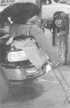 "It allows you to work with both hands in a comfortable position without back pain or fatigue," says Jim Terveen, Sioux Falls, S. Dak. "What sets it apart from other commercial caddies on the market is its simple, lightweight design, which makes it easy to set up and use. My friend Earl Muelling made this tool years ago for use in his repair shop. He built it after he got tired of bending over the top of engines while trying to find a way to brace himself in a somewhat comfortable position. His design allows you to reach even the back side of the engine compartment without any problems.