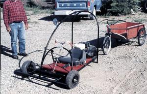 The seat - designed for a garden tractor - is bolted to a plywood floor that's bolted to an angle iron frame. The driver is protected by a roll cage made out of 1-in. dia., thin wall tubing. The rig has a hitch on back, allowing it to pull wagons and carts. The wide front wheels make it stable, and the single drive wheel on back provides constant traction. (Neil Ohler, Box 127, Stavely, Alberta, Canada T0L 1Z0 ph 403 549-2480)