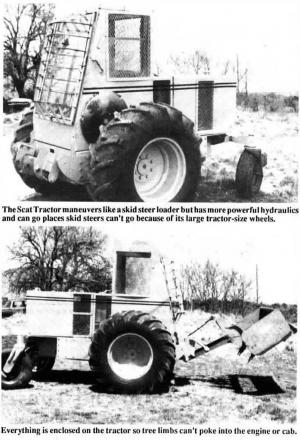 "It'll take more punishment in heavy brush than a conventional tractor because every-thing is enclosed," says Beckloff. "Tree limbs aren't likely to poke into the radiator or jerk off hydraulic hoses, and the Tuffak plastic glass on front of the cab is nearly unbreakable. It has more powerful hydrau¡lics than a skid steer loader and can go where a skid steer loader can't go because of the large tires and improved center of bal¡ance. The weight of the load is over the drive wheels which makes the tractor easy to maneuver in soft soil. It maneuvers much like a swather. The combination of rear castor wheels and hydrostatic-drive front wheels makes it possible to turn the ma-chine around in its tracks without skidding or tearing up ground."