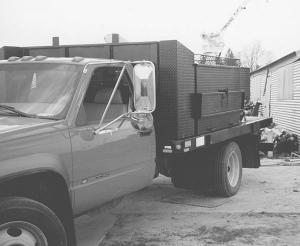 The truck is a 1999 Chevrolet 3500A 1-ton model equipped with a 12-ft. flatbed on it. On each side of the flatbed are toolboxes that measure 4 ft. long, 4 ft. high, and 2 ft. deep. The door on each toolbox is hinged at the top and swings out - with help from a pair of gas shock assist cylinders - to create a "roof" that's about 8 ft. high. A metal bench folds down just below each toolbox to create a 1-ft. deep work area.