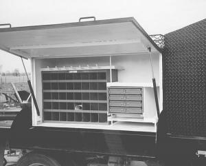 The toolbox on the other side of the truck is filled with parts trays. A 4-ft. wide open area between the boxes provides room for extra storage.