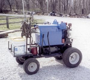 "I had it on a trailer for awhile but it took up too much room in the barn. So I took it off the trailer for a while but then, when I needed it outside, I had to find a way to transport it. So I mounted the welder on an old Husky garden tractor with a blown engine, along with a 1/3 hp electric motor that's belted to the transmission on the mower. I made a hand clutch and rigged the steering to a lever. Both stick out to the right side of the machine. I bent the gear shift lever so it sticks out to the left.