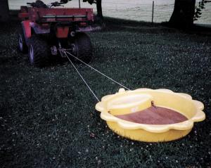 I made a calf carrier out of a heavy plastic wading pool that I bought at a local discount store. I cut a piece of 3/4-in. plywood to fit inside it, held in place by carriage bolts. Two short pieces of flat iron were used to make attachment points for a nylon tow rope. I used it last spring for the first time and it worked well. The pool cost $10 and the bolts less than $5. I already had the rest of the material. (Clinton Whitney, 1723 S. Country Club Rd., Warsaw, Ind. 46580)