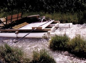 I've made improvements to the home-built floating paddle pump previously featured in FARM SHOW (Vol. 26, No. 6). The system uses the power of the flowing water to pump water from a creek to drinking troughs in adjacent pastures. It uses 12-ft. long, 12-in. dia. pvc pipes as pontoons. The flowing water powers a small piston pump that lifts water through a 1-in. dia. buried plastic pipe, lifting it 70 ft. and pushing it for a half mile or more to tanks in distant pastures. The tanks are made of old industrial tires mounted on concrete pads. At 1 1/2 gallons per minute, my paddle pump can easily supply 100 head. (Orrin Hart, Claresholm, Alberta)