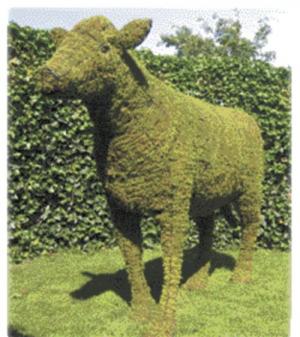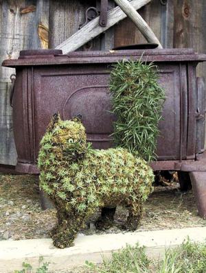 More than 70 "wire art" characters are available. The wire is epoxy powder coated to prevent rust. To add accent plants, you simply poke holes into the moss and then plug the plants into the holes. The company makes suggestions on which plants to use. It has also compiled a list of growers who carry topiary friendly plants.