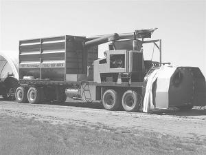 "This unit is designed for custom work or big operations, but a person could build a smaller version," he says. "It has its own motor and hydraulic system, using a rebuilt 225 hp, 466 Deere motor taken from an 8820 Deere combine. This runs a 12 by 52-in. roller mill as well as the hydraulic system. It's built on a hi-boy trailer, so it's easy to transport. The tunnel that the bag goes on extends off the back of the trailer and lifts hydraulically for transport."