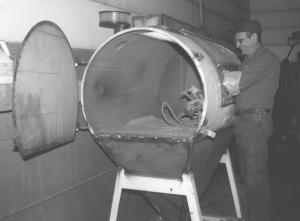 He cut out one end of the tank to make an access door and cut off the bottom of the tank to weld in a home-built metal hopper. A grate on top of the hopper serves as a table to work on and allows the sand to fall below for reuse.