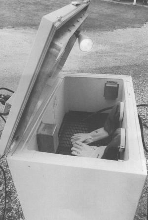 He wired a couple lights into the blast cabinet protected by sheet metal cone He installed a metal grate on top of the compressor housing at the bottom of the freezer. Angle iron from an old bed frame and metal screws hold it in place. The grate comes out for cleaning when the pressure sand blaster goes empty after 100 lbs. of sand is used up.