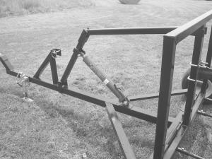 The unit comes with a 48-in. bale spear and two 26-in. stabilizing spears that mount on a hinged frame. A hand-operated, 8-ton jack, with a 19 3/4-in. stroke, is used to tip the hinged frame forward or backward. The bale is held at a 45 degree angle during transport.