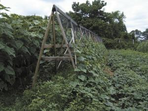 Nachamkin set up eight large A-frames out in the field to grow cucumbers.