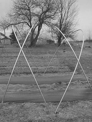 "I don't suggest making them more than 100 ft. long if you want acceptable air circulation," he says. "We use them in the spring until the air gets warm enough to remove the plastic. To move them, I generally close the scissors and take them up and over the plants, then set them down and open them up again. As long as the two feet on each side are attached to the ground, they won't open up any more and they'll support a fair amount of weight."
