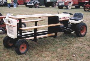 The 1960's Bolens tractor was custom built by a man from Clear Lake, Minn., who had to let go of his invention because his wife wanted more space in their garage. He had cut the tractor behind the front wheels and axle, then built a table with a metal support frame and bolted it to the tractor. He also greatly lengthened the steering linkage.