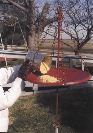 When we upgraded our TV satellite dish, we decided to turn the old dish into a bird feeder. We drilled a hole in the center of the dish large enough for a piece of rerod, which sticks down into a pipe in the ground. At the top of the rerod, we welded a large washer into which we drilled four holes to hold chain links. We ran chain down to four holes along the edge of the dish. The top and bottom links of the chain were cut open and then bend out to fit into the holes. The height can be adjusted by moving the clamp. (C.F. Marley, P.O. Box 93, Nokomis, Ill. 62075 ph 217 563-2588)