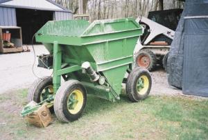 Honnold extended the sides of the rock box so gravel could be heaped in the center. The sides also were reinforced with angle iron. To unload the gravel, he installed a commercial spreader that he cut down to fit the 4-ft. spread.