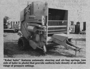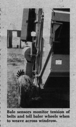 Robot Baler Weaves To Form Even Bales HAY & FORAGE HARVESTING Balers (6) 9-6-27 What may be the most sophisticated round baler ever was unveiled at the recent Farm Progress Show in Indiana by Vermeer Mfg. Co., Pella, Iowa. The new 605J baler, which has built-in sensors and hydraulic-controlled steering, automatically weaves back and forth across windrows to form perfectly even bales.