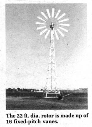 The new S.J. Wind-Power windmill's rotor is 22 ft. in dia. It consists of 16 fixed-pitch vanes made of lightweight urethane foam over a sheet metal blade. Each vane weighs about 4 lbs.